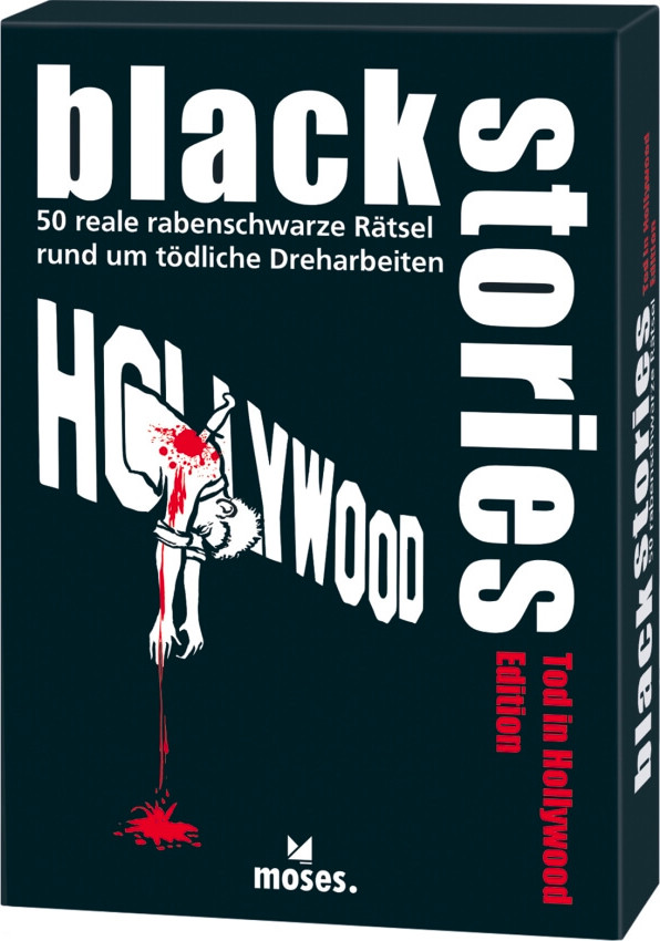 El juego de cartas "Black Stories" vuelve con la edición "Black Stories: Muerte en Hollywood". Esta vez encontrarás accidentes reales que ocurrieron durante los rodajes: actores que llevaron su actuación al límite, trucos y acrobacias que acabaron en desastre, directores ambiciosos que le hicieron la vida imposible al resto del equipo... No importa si se se trata de estrellas, directores o hasta ganadores de Oscar: ¡nadie acabará bien parado!