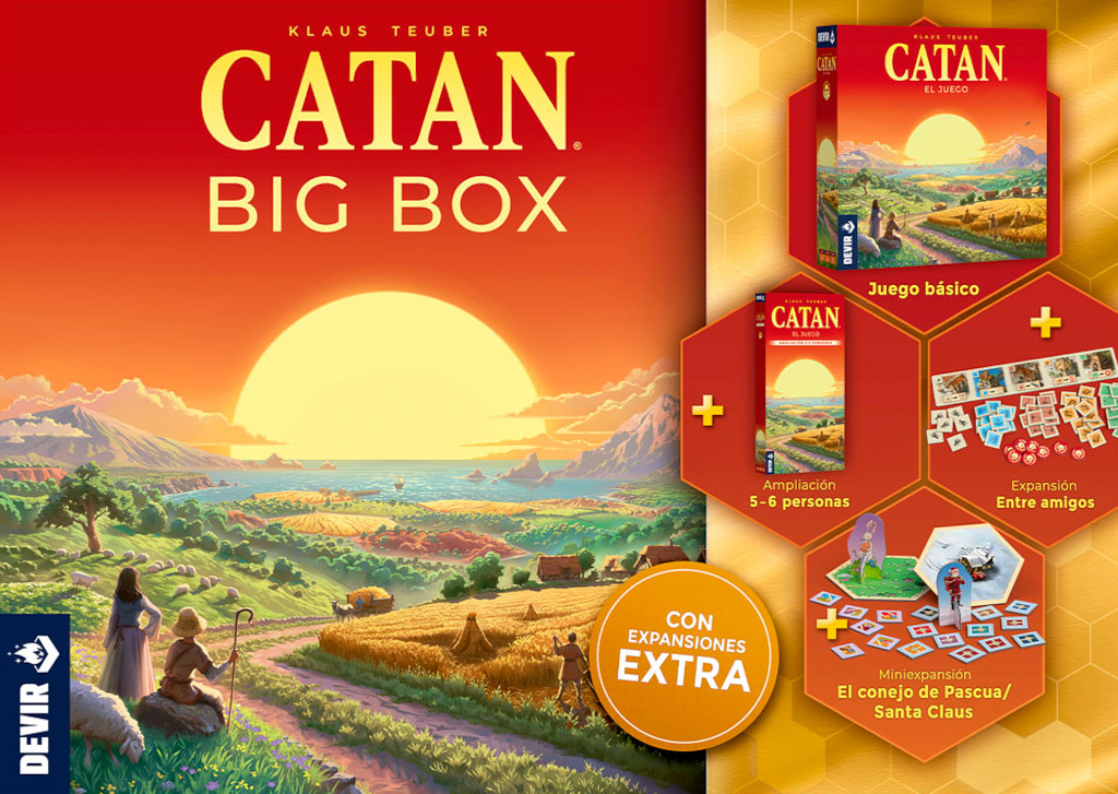 "Catan: Big Box" es un pack del galardonado juego de mesa "Catan" que nos trae el juego básico, la ampliación para cinco a seis jugadores, dos escenarios especiales ("Península Ibérica" y "Viaje por la India") y tres miniexpansiones ("Entre amigos", "Santa Claus" y "El conejo de Pascua"), ¡en una sola caja!