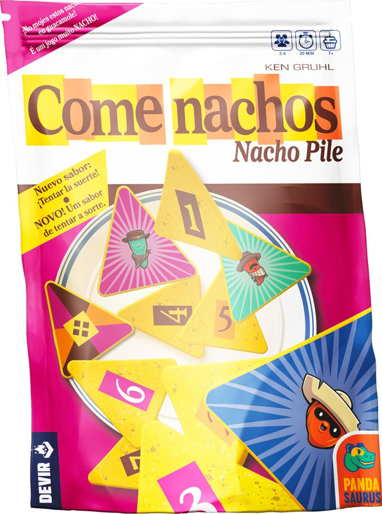 "Come nachos" es un juego de mesa, de ritmo rápido y mucha energía, en el que las fichas volarán de un lado a otro mientras los jugadores compiten por platos y estómagos llenos. En la partida, los jugadores deben probar su suerte para apilar sus platos de nachos, pero también robar hábilmente las fichas correspondientes de otros jugadores.