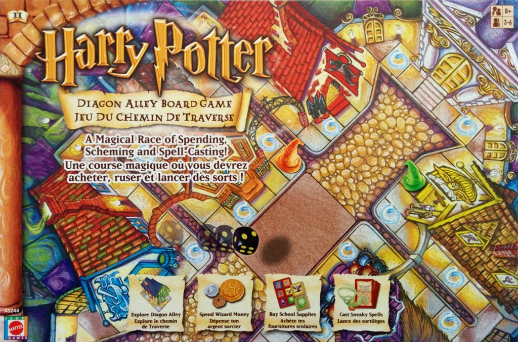 El objetivo de este juego de mesa es visitar todas las tiendas del tablero y comprar uno de cada tipo de artículo para el baúl de su mago. El primer jugador en llenar su tronco y regresar al caldero de Leaky gana. Tienes que pasar por el Gringott's Wizard Bank varias veces para conseguir suficiente dinero (galleones de plástico, hoces y knuts) para comprar todo. La lista de suministros escolares de Hogwarts incluye botellas de poción, calderos, batas, varitas, libros y búhos. Las tiendas no tienen suficiente para todos, así que tienes que darte prisa. Las cartas de hechizos y estragos te permiten tomar objetos, moverte usando polvo de floo, cerrar tiendas y mucho más. Siempre existe el peligro de que te envíen a Knockturn Alley por medio de calderos dobles.