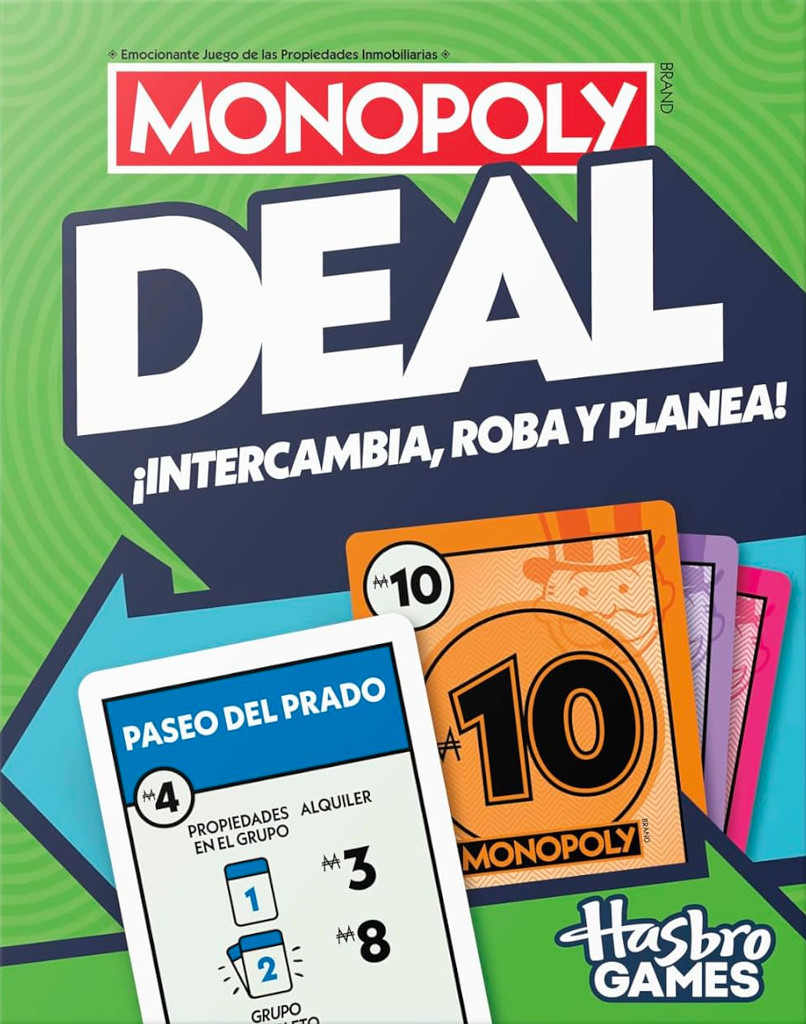 ¡El adictivo juego de mesa de cartas de ritmo rápido donde tu suerte puede cambiar con tan sólo jugar una carta! Colecciona tres series completas de propiedad, pero cuidado con los recaudadores, tratos forzados y los temidos rompre tratos, lo que podría cambiar tus fortunas en cualquier momento! El objetivo del juego es ser el primer jugador en conseguir tres conjuntos de propiedades completas de diferentes colores.