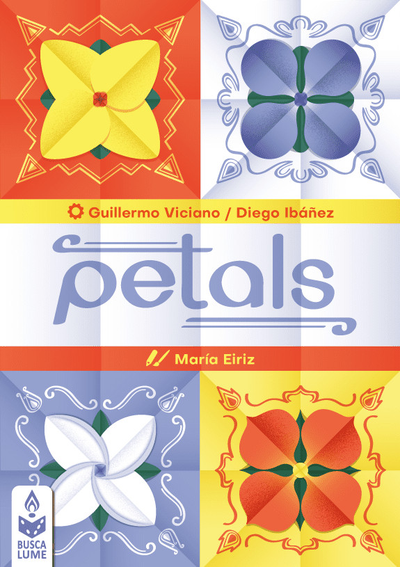 Cada carta de "Petals" contiene partes de cuatro flores elementales de colores distintos y cada flor contiene un número diferente. En tu turno tendrás dos cartas en la mano para elegir cuál te conviene jugar, junto a alguna carta que ya esté sobre la mesa. Tu objetivo será hacer coincidir números, colores o ambas cosas, y así puntuar en cada uno de los cuatro marcadores elementales, mientras se va formando un precioso jardín ante tus ojos.