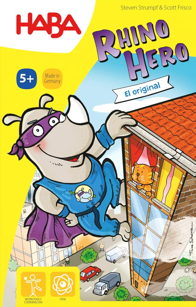Esto hace que se tambaleen hasta los rascacielos más sólidos. ¿Podéis ayudar a Rhino Hero a cumplir su tambaleante misión, construir un rascacielos que sea estable y ganar la partida?