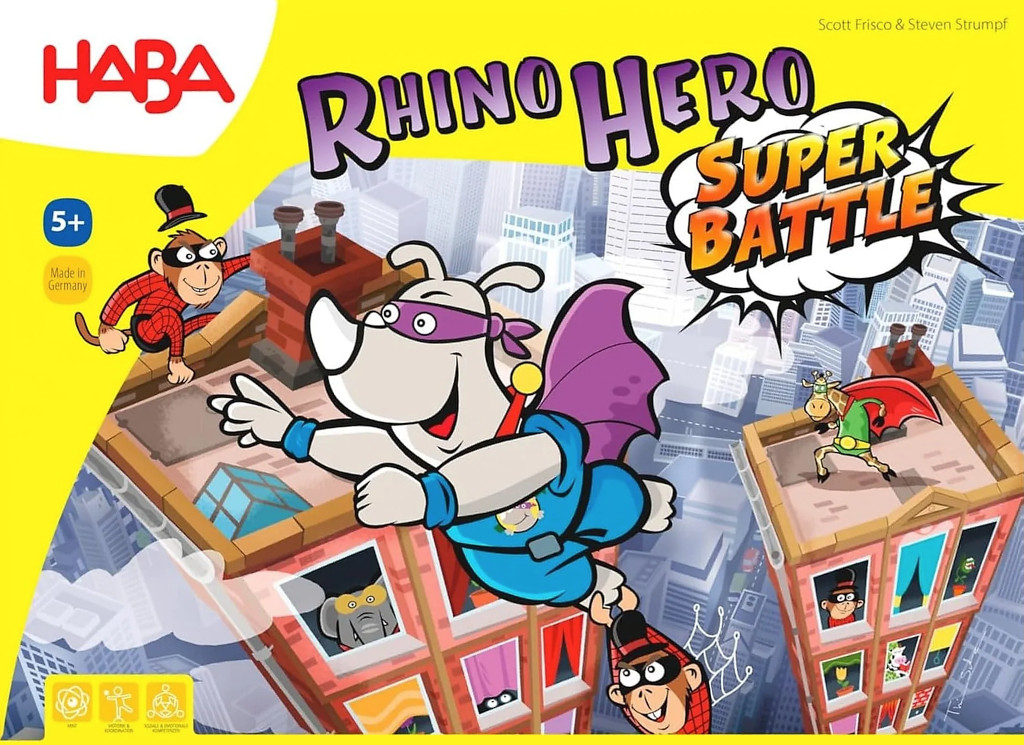 "Rhino Hero: Super Battle" es la evolución del juego de mesa "Super Rino". Pero esta vez no sólo se escalarán los rascacielos más tambaleantes, sino que también se disputarán duras batallas entre los cuatro superhéroes: Rhino Hero, Jirafa Boy, Big E. y Batgüin. ¿Quién se batirá en duelo por la victoria y no se dejará amedrentar por los monos-araña?
