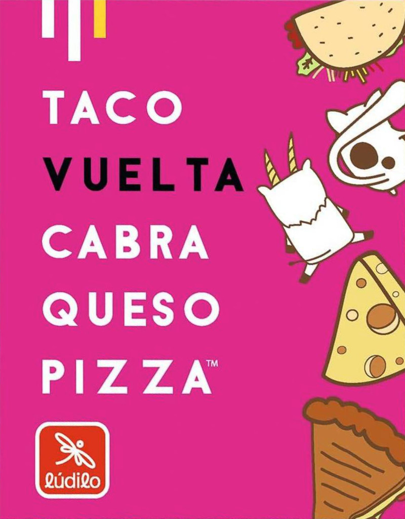 ¡"Taco Gato Cabra Queso Pizza" está de vuelta con nuevos personajes y nuevas reglas! Al igual que en "Snap" o "Dobble", en "Taco Vuelta Cabra Queso Pizza" cada jugador coloca una carta de su mano bocarriba en una pila común mientras dice, en orden, las palabras: "Taco", "Gato", "Cabra", "Queso", "Pizza".