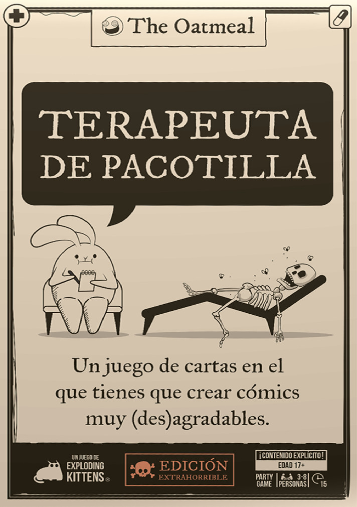 "Terapeuta de Pacotilla" es un party de cartas en el que quienes juegan crean cómics absurdos y humorísticos a partir de cartas de "pregunta", "respuesta" y "tratamiento". El objetivo es formar la historia más graciosa y acumular tres puntos para ganar la partida.