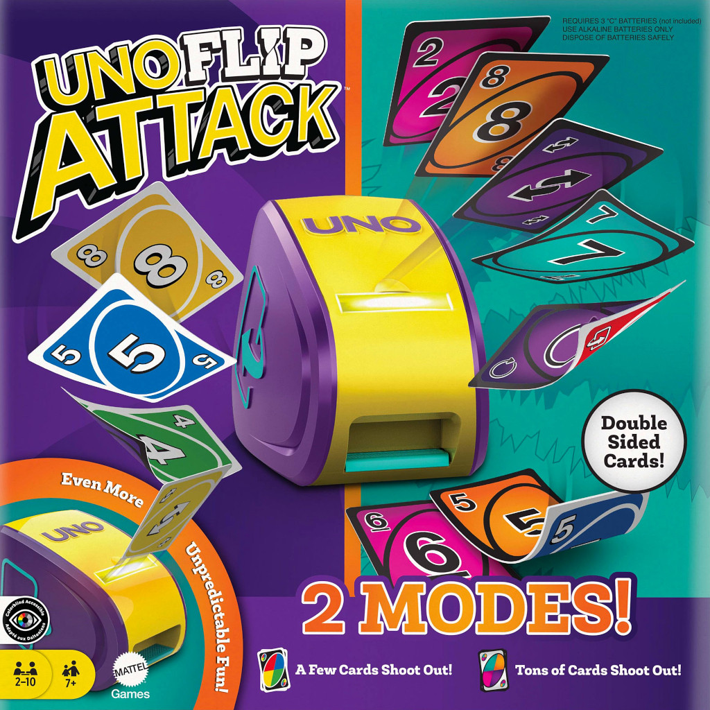 "UNO Flip Attack" combina la estrategia revolucionaria de cambiar el mazo del lado "normal" al lado "salvaje" con la emoción impredecible del lanzador de cartas de ataque.