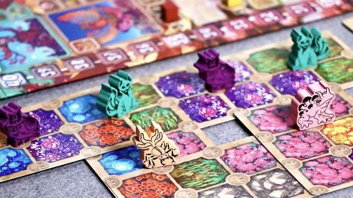 Tendremos que construir jardines de té mientras gestionamos nuestras hojas de té y aumentamos nuestro imperio. Un juego donde es un gusto verlo abierto en mesa. Las tonalidades pastel que tiene el juego me gustan, y mucho. El resultado final ha sido un juego elegante y limpio a nivel visual. En ningún momento vemos los componentes saturados de símbolos o colores.
